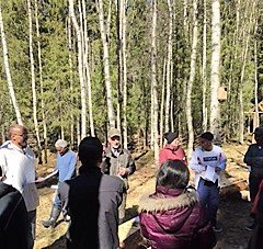 Michael pratar med eleverna om skillnaderna mellan olika trädslagHelena Lindahl(C) och Isak From(S) samt representanter från pressen besökte den 23 maj skolskogen i Dorotea där projektet ”Natur för alla” pågår. ”Natur för alla” innebär ett nytt sätt att bedriva SFI-undervisning på då eleverna tillsammans är med och iordningställer skolskogen.