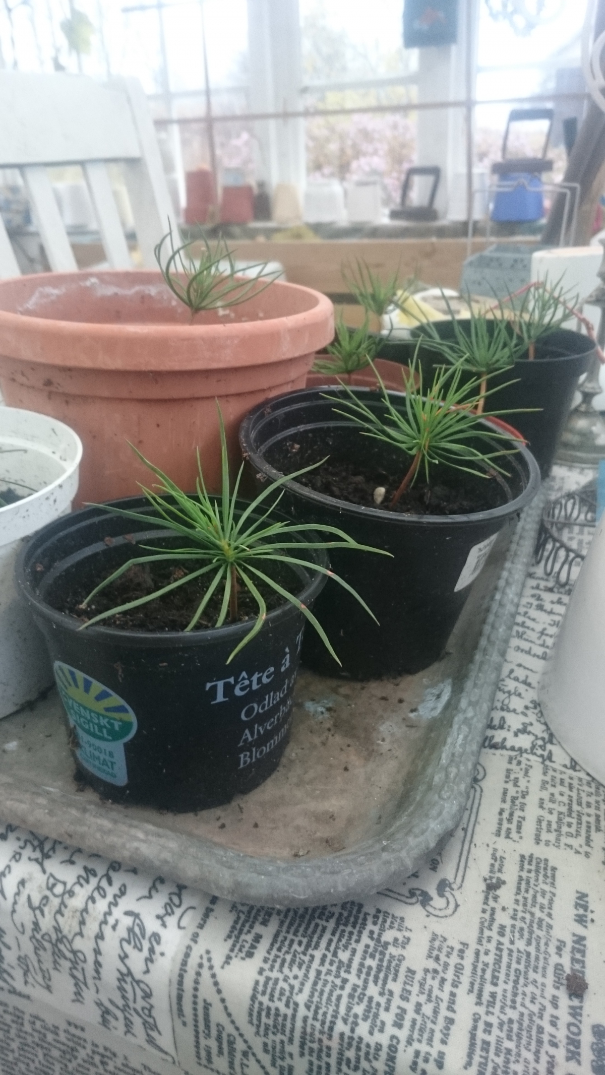 Jag har under våren och sommaren drivit upp plantor från frö av sockertall, Pinus Lambertiana. De är nu ca 6-8 cm höga och står i krukor. Hur skall jag övervintra dem? Utomhus, eller ska de stå varmt inomhus? När är de stora nog att plantera ut?