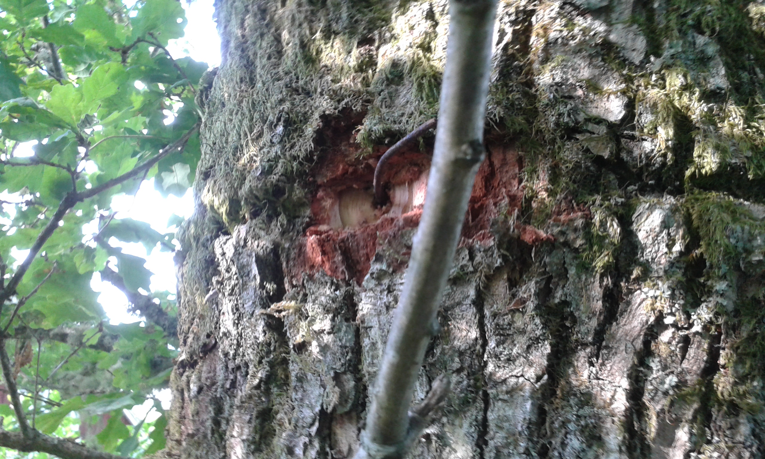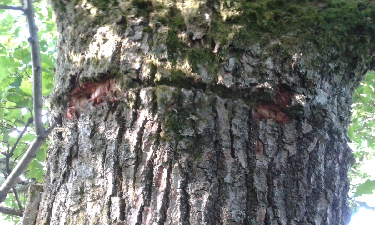 Jag har en ek, ca 25m, med en fågelholk på, 10m upp, som sattes fast för ca 35 år sen, med järntråd runt stammen. Den har skurit in i barken ca 1 cm. Kan jag ta bort den (med stämjärn?) eller bör jag låta den vara? Vem frågar man?
