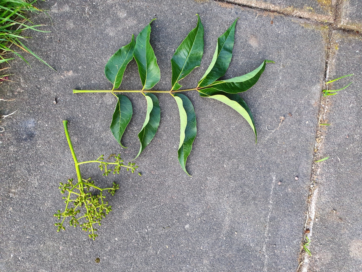 Svårt att säga säkert. Ser ut som korkträd Phellodendron. Gnugga ett blad mellan fingrarna. Luktar det som fotsvett, gamla gymnastikskor och annat unket så är det korkträd. Knopparna sitter parvis på kvisten.
