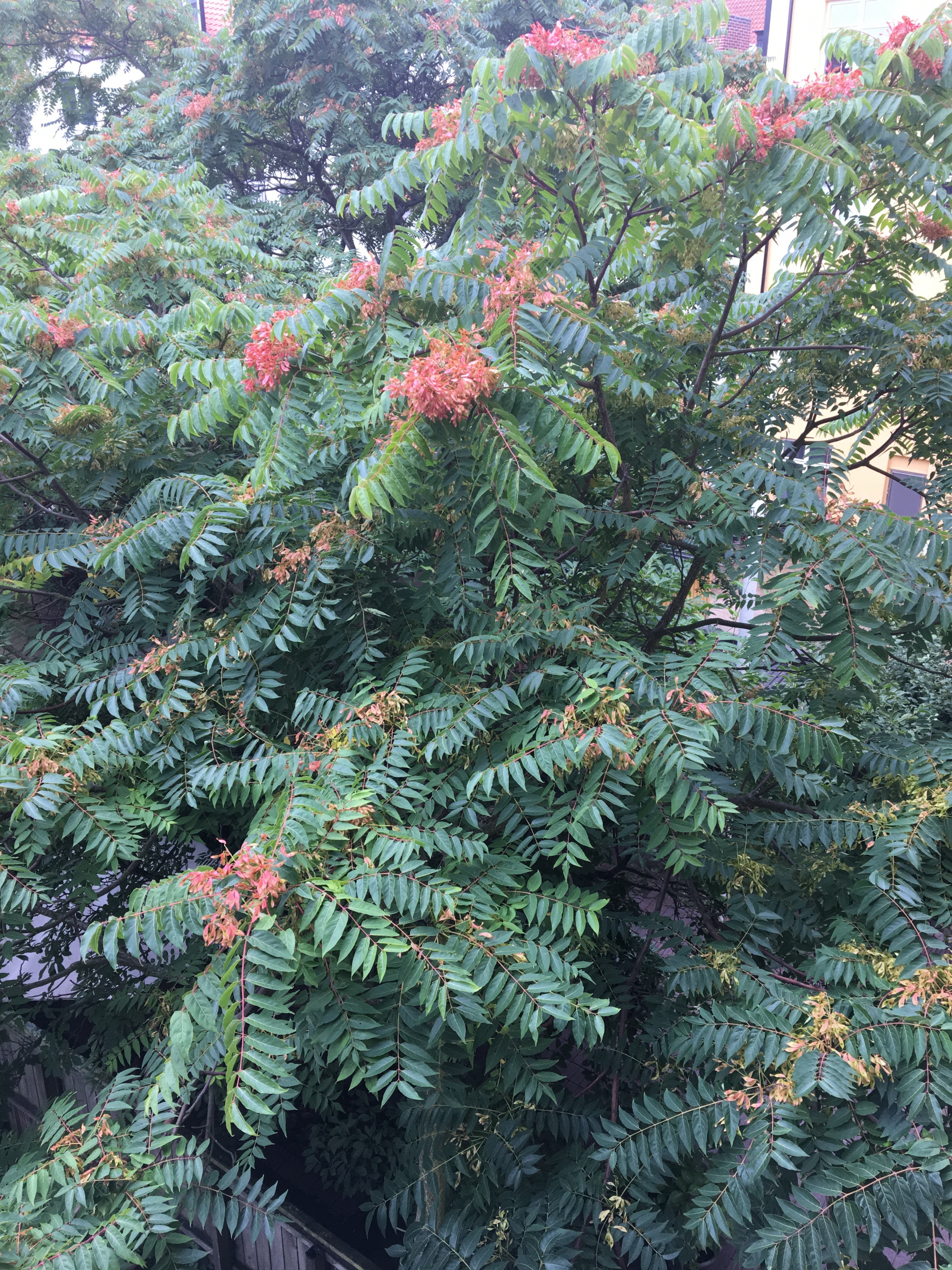 Först tyckte jag att det såg ut som någon sorts sumak Rhus. Sedan försökte jag förstora upp frö/blomvipporna och då tror jag att fröna liknar gudaträdets. Gudaträdet Ailantus altissima får långa blad. Fröna sitter i klasar och är en tillplattad vinge med ett runt litet frö i. Titta på en bild från google och jämför med ditt träd.