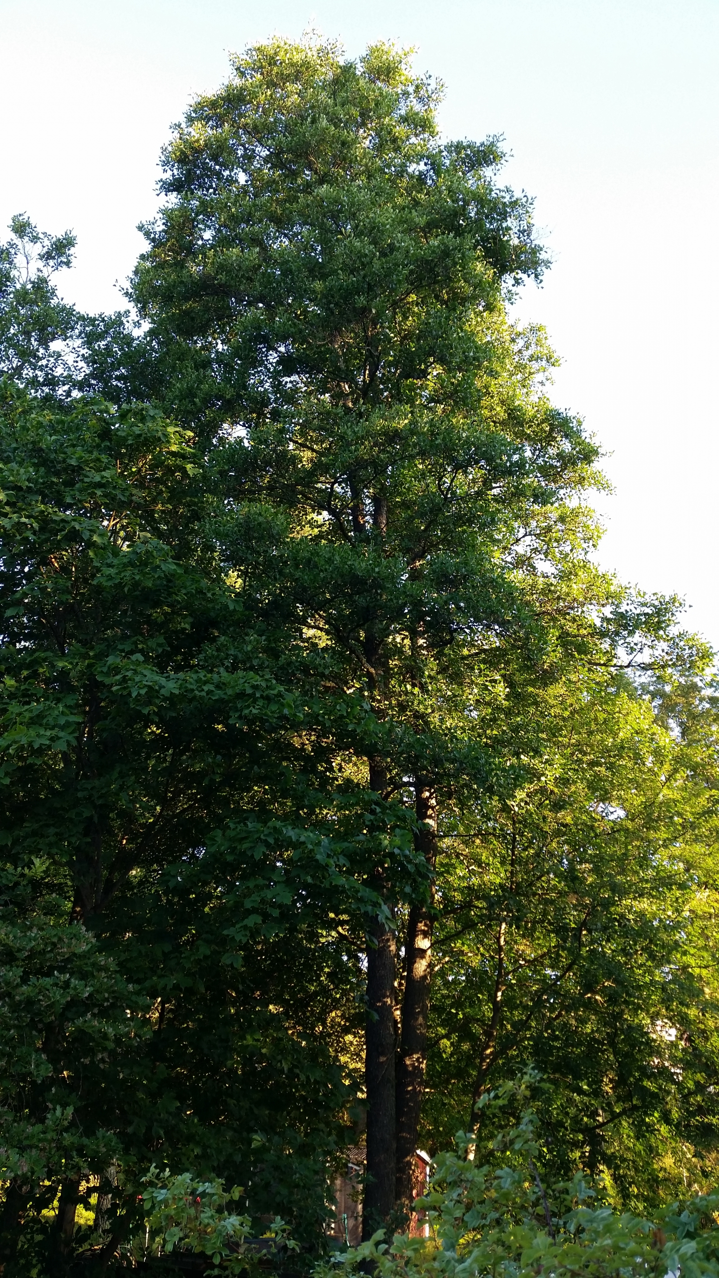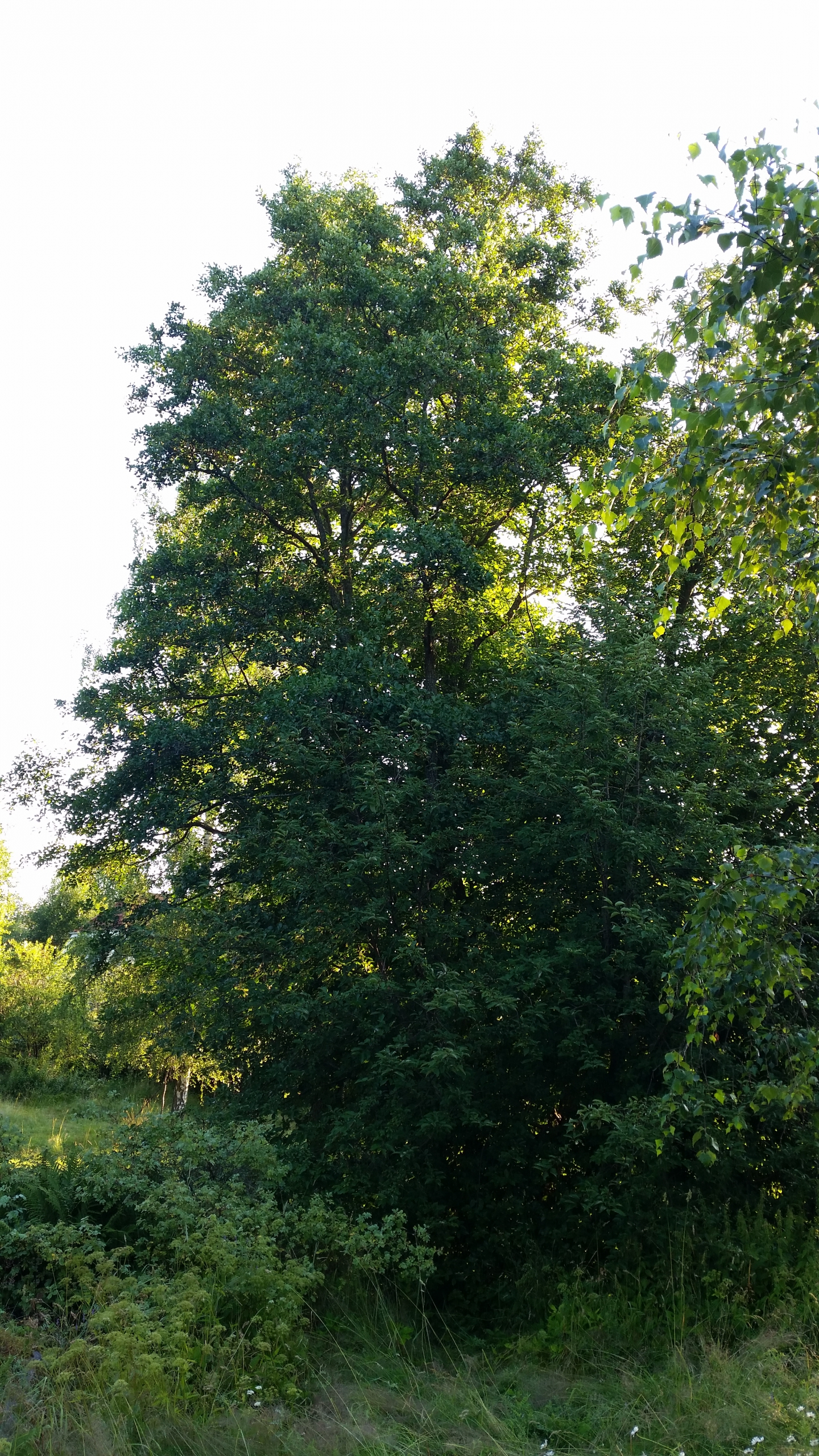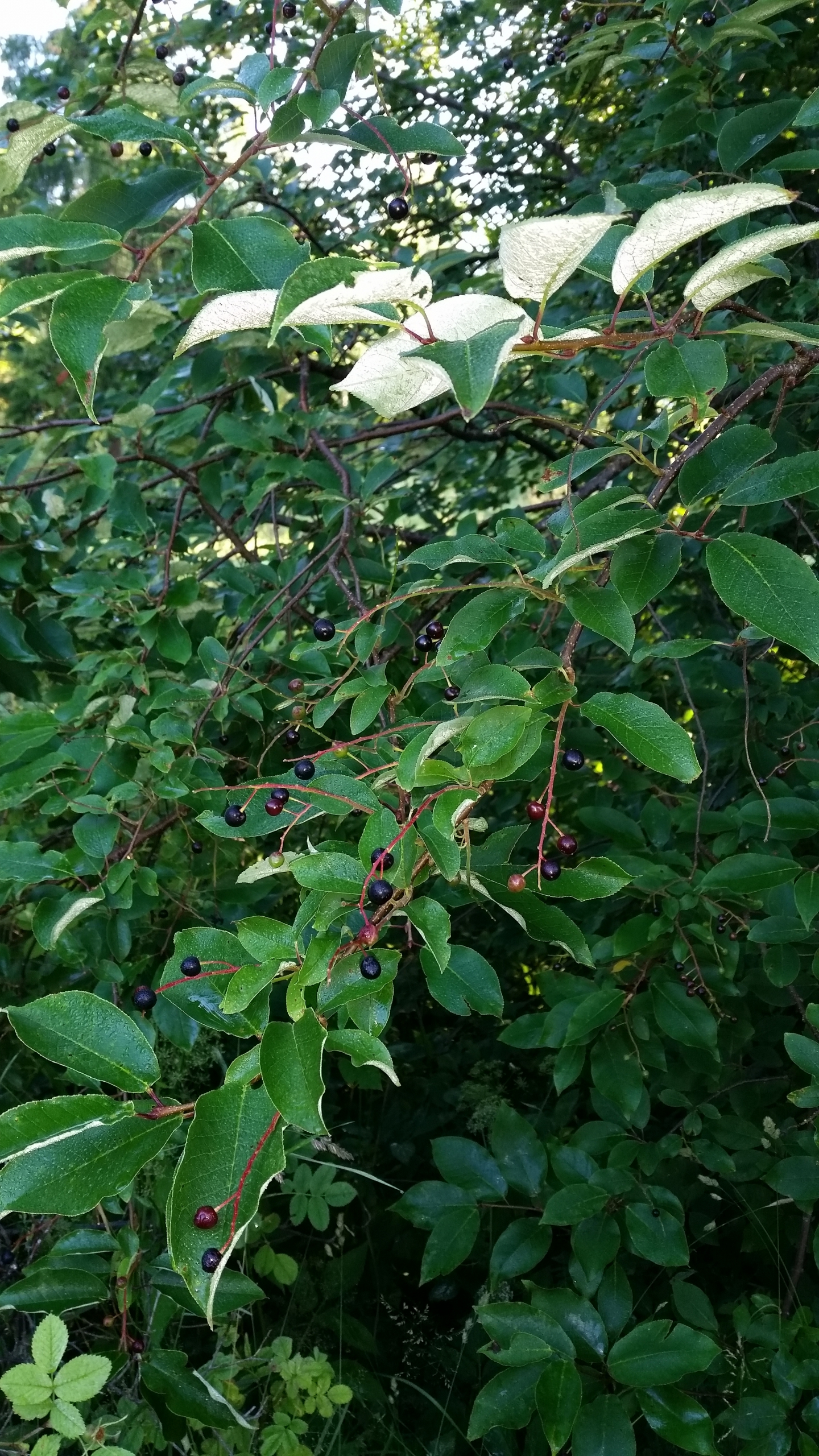 Trädet du har är en Hägg (Prunus padus) och är en körsbärssläkting, därav bären. Den blommar med stora vita klasar på våren. Vad som förbryllar mig är hur högt det är men den kanske har stått trångt tidigare och tvingats uppåt.