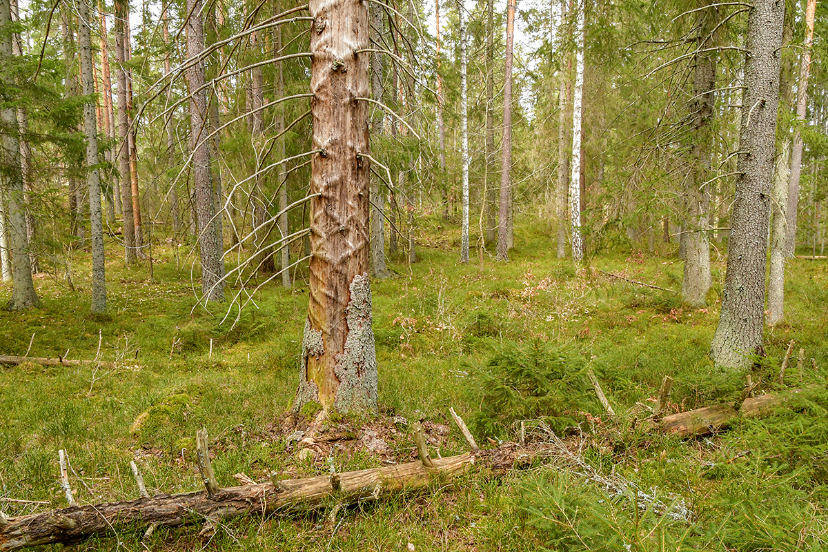 Vad beror det på att tallen fortfarande står upp trots att barken ramlat av? | SkogsSverige