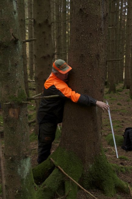 PO gillar deras idéer och har utbildat sig till skog- och träingenjör på Linnéuniversitetet. Han mätt upp ett antal virkesrika skogar för att se om man kan nå de volymer som tvillingarna siktar på. Och han har fått nästan hissnande resultat. Vi går in i ett bestånd på en knapp hektar. Skogen planterades för 48 år sedan och snittet på provytorna är 1345 kubikmeter per hektar. Det blir 28 kubik om året sedan plantering.