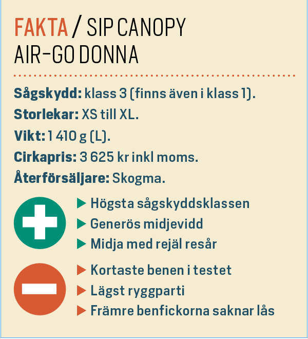 Sip Canopy Air-Go Donna är en bekväm sågskyddsbyxa med testets mest generösa midjevidd. Ryggpartiet är testets lägsta, men den breda runtomgående resåren i midjan ger bra passform. Foto: Per Ericsson