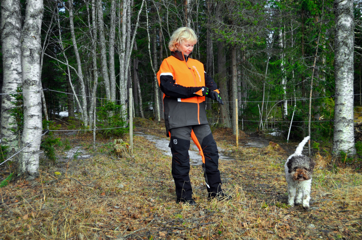 Timbermen Allround Dam har testets mest kvinnliga passformer, men kan kräva att man väljer en storlek större. Byxorna är smidiga och följsamma och har bra fickor plus riktig damask med hake för sågskyddskänga. Ryggpartiet är högt, men byxorna saknar fästen för hängslen. Skogsjackan har axlar med förstärkning och reflexer och ärmarna kan tas loss så att jackan blir en väst. Foto: Per Ericsson