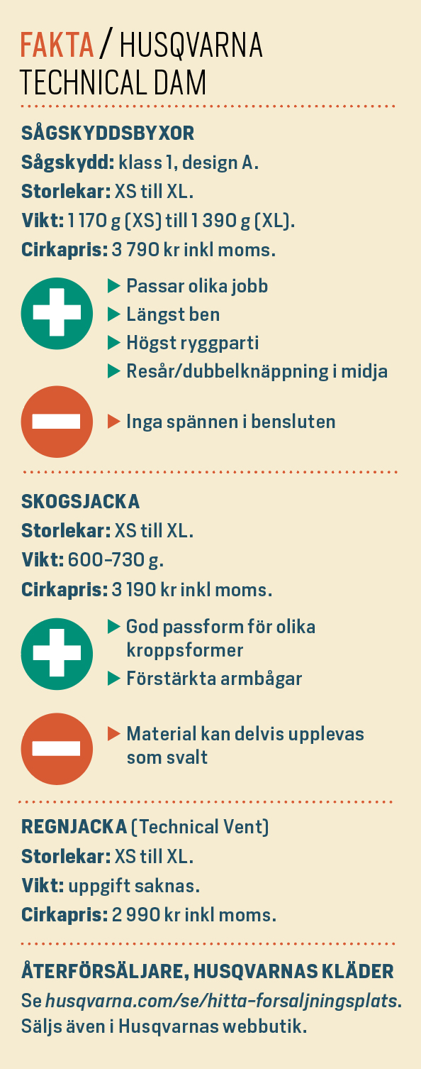 Som en parentes kan vi nämna att den dyrare skogsjackan Technical Extreme Dam enligt Husqvarna kommer att utgå ur sortimentet och den ingår därför inte i vårt test.