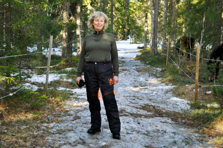 Husqvarna Technical Dam är sågskyddskläder med kvinnlig och ledig passform. Förböjda knän är en speciell funktion som gör byxbenen mindre styva. Benens baksidor har generösa ventilationsöppningar. Foto: Per Ericsson