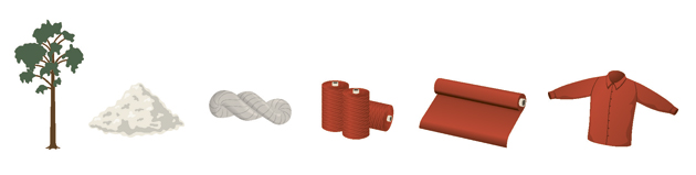 Lång produktionskedja. Trädet (1) görs till dissolvingmassa (2) som skeppas till utländska textilfiberfabriker. Där spinns en textilfiber, antingen viskos eller lyocell, från massan. Textilfibern säljs sedan vidare till spinneri som tillverkar garn (3). Garnet säljs sedan till väveri (4) i som gör ett tyg (5) som färgas. Det färdiga tyget säljs sedan till manufaktur som tillverkar kläder (6) som säljs till klädkedjor. Ill: Per Torneus/Pictoform