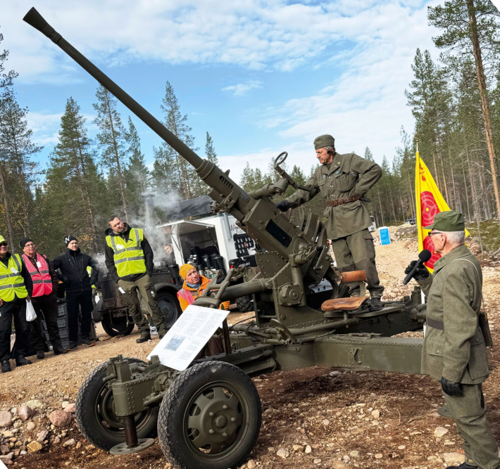 En luftvärnskanon i skogen, hur gick det här till? Jo, Orsa Besparingsskog köpte in två kanoner från Bofors i början av 1940-talet och skänkte dem till den svenska armén, men ingen vet riktigt vart de tog vägen efter kriget. Denna renoverade pjäs av samma modell ägs av besparingsskogen och väckte stor uppmärksamhet bland exkursionsdeltagarna. Normalt sett förvaras den hos Dalaregementet I13 i Falun och hålls i skick av Dalarnas hemvärn. För säkerhets skull ska det poängteras att den inte är brukbar.