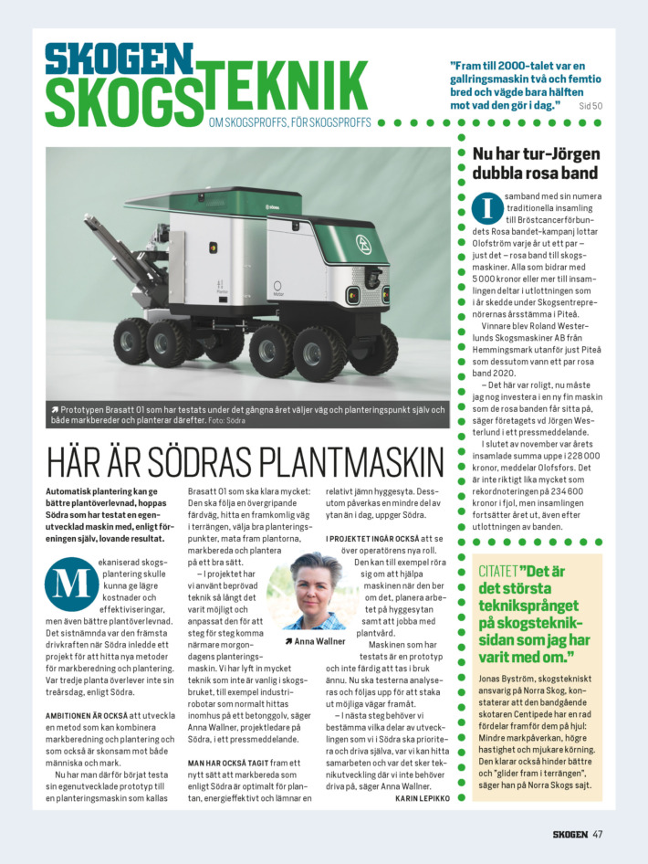 BRASATT Södra har på egen hand utvecklat en självgående planteringsmaskin. I SKOGEN 12/2023 berättade vi om testerna av en prototyp som väljer väg och planteringspunkt själv och både markbereder och planterar därefter.