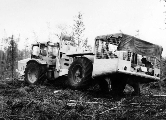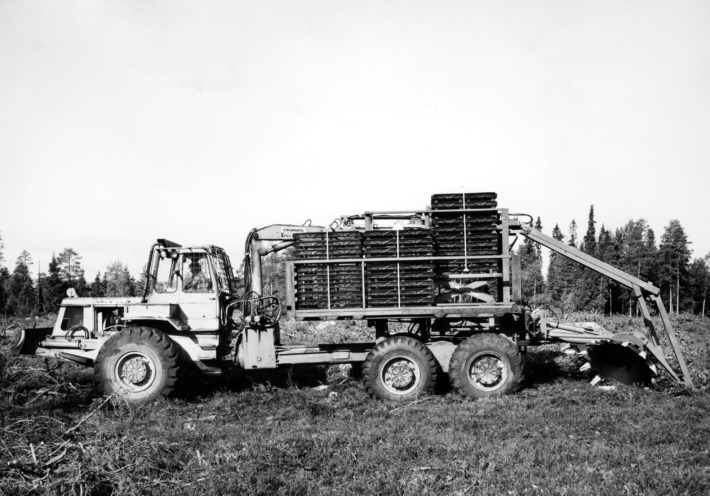 Här är ett tidigt exempel på försök till mekaniserad plantering från mitten av 1960-talet – men exakt hur mekaniserad kan väl diskuteras. I kuren bakom skogstraktorn Volvo BM 667 Timmerkalle satt två operatörer som såg till att plantorna kom i jorden som maskinens billar krafsat fram. Komforten ska nog talas tyst om …