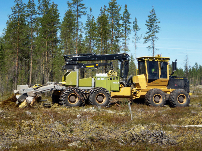 Harvning och samtidig sådd av frö var en metod som utvecklades under 1990- talet. Här dras såddharven Bracke S35.a av en Tigercat 1075B. (Foto: Per Ericsson)