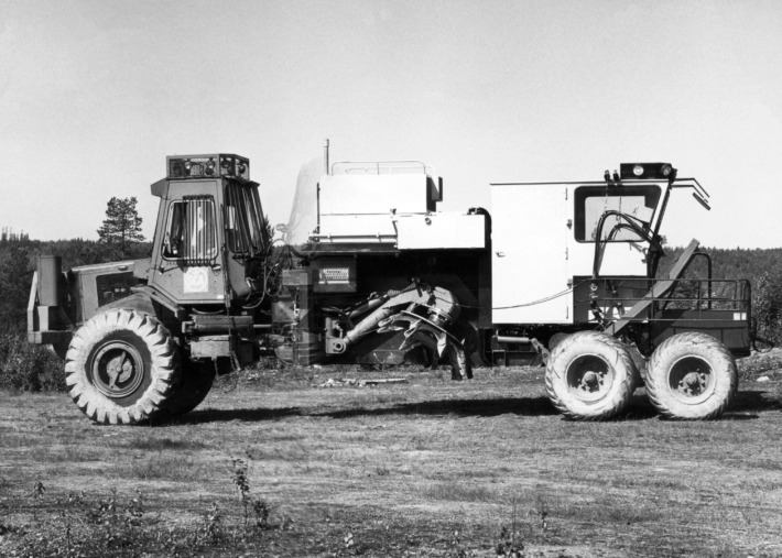 Här testar Forest Innovation AB (Fiab) sin kombination av tvåradig markberedare och planterare i trakterna av Stensele i Västerbotten hösten 1980. Den lokala anknytningen förstärks genom att maskinen är byggd på skotaren SMV 21 från Sandbergs Mekaniska Verkstad i just Stensele. Maskinen var ett steg framåt, eftersom den var helautomatiserad och inte krävde någon plantör i en särskild hytt.