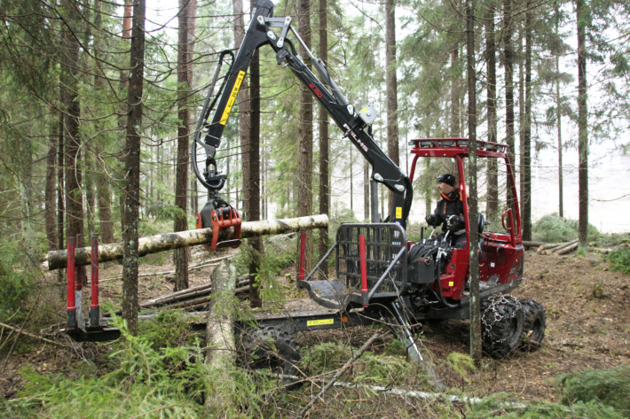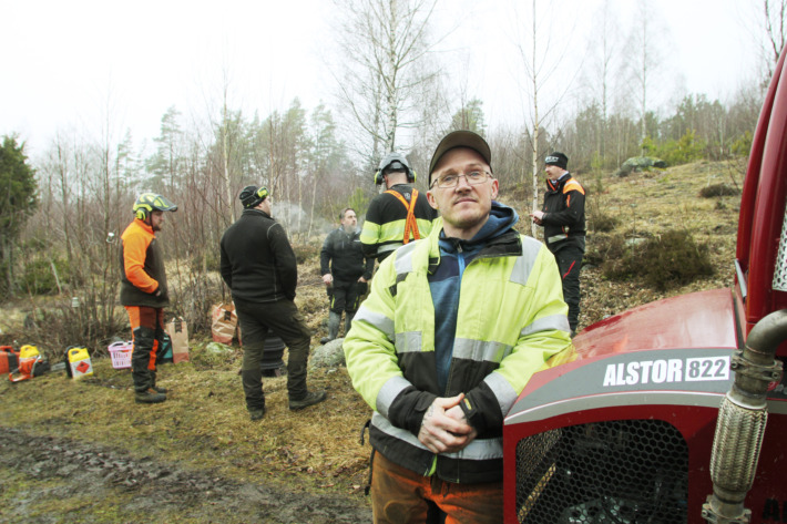 Fyra man, Martin inkluderad, fäller och kvistar medan de tre andra ser till att få virket ur skogen, såväl med handkraft som med hjälp av en Alstor 822 som Martin köpte ny för ett tag sedan. Valet stod mellan en skogsutrustad jordbrukstraktor med griplastarvagn eller en riktig miniskotare. Ekonomi och smidigheten hos Alstor-skotaren blev avgörande.