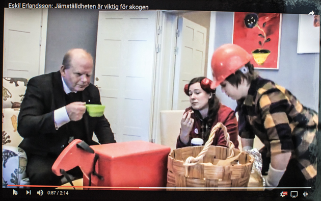 Våren 2011. Jämställt skogsbruk dras igång och konsultföretaget Add Gender anlitas. En film spelas in uppe på kansliet. Den är på sitt sätt ganska underhållande och finns på YouTube. Handlingen är enkel: Minister Eskil Erlandsson bjuds på kaffe i plastkåsa av jämställdhetsexperterna Pernilla Alexandersson och Jenny Claesson. Iklädda skyddshjälmar och storrutiga flanellskjortor presenterar de en idé: Att en röd, trojansk trähäst ska säljas till skogsföretagen. Därifrån ska förändringsarbetarna klättra ut och börja verka inifrån.