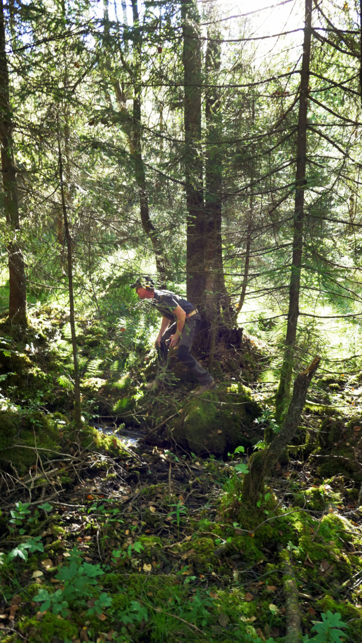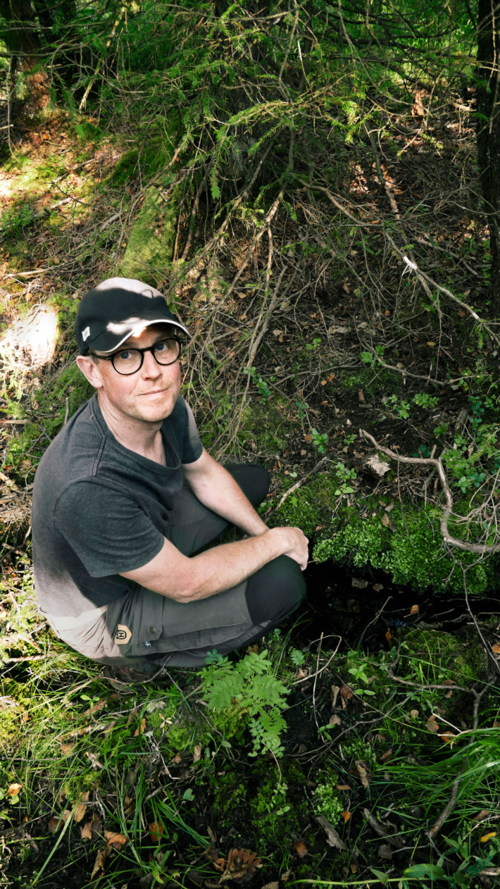 Han hoppar mellan tuvorna när han visar upp sitt naturvårdsområde för SKOGEN, men det går inte att undvika rejäla klafs. Så är det i en alltmer sällsynt naturtyp där det livsviktiga skogsvattnet flödar mellan rötter och mossa.