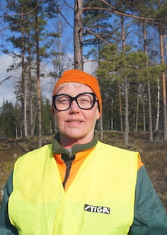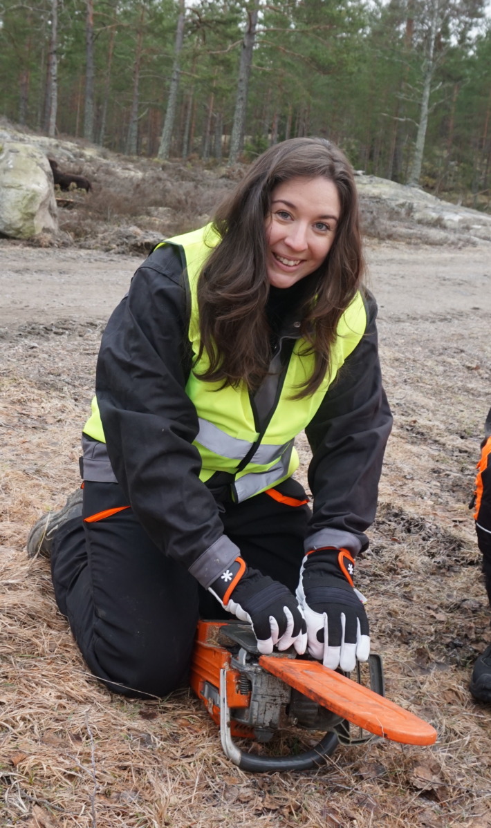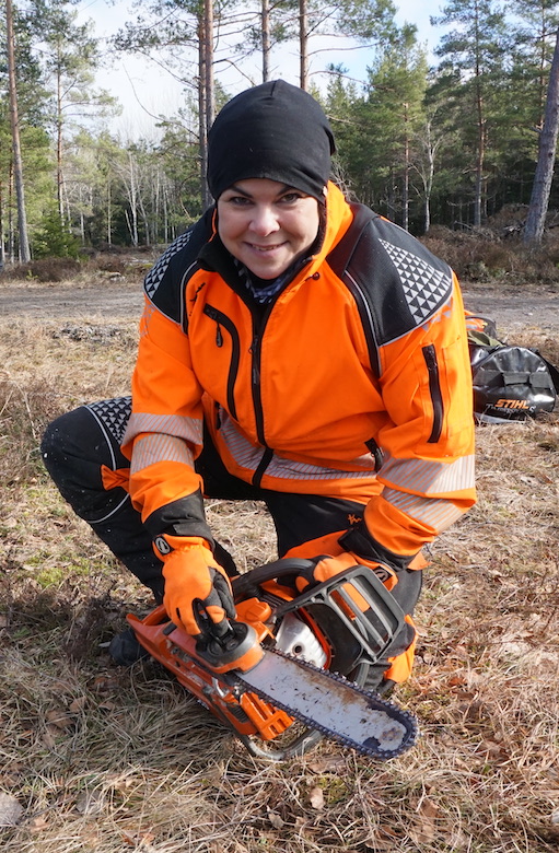 Helena Storckenfeldt (M) har hållit i motorsåg förr – hon bor på en skogsgård. Men hon vill bli säkrare och bättra på kunskaperna. Hon gillar också den teoretiska delen, som skogshistoria.