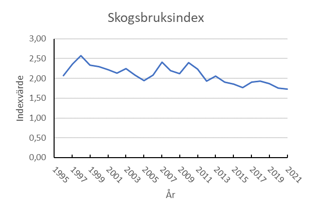 Sedan 2000 har skogsbruksindex fallit från 2,25 till 1,80.