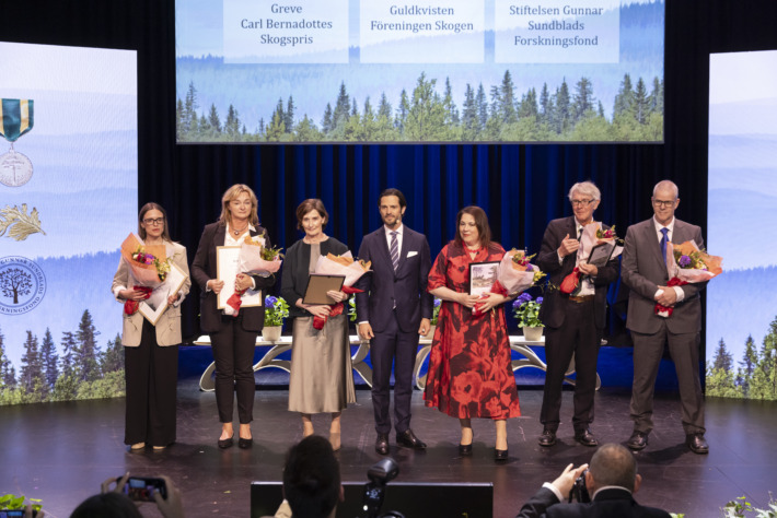 Föreningen Skogen gav Guldkvistar till Eva Stattin, Stora Enso, Karin Fällman Lillqvist, Skogssällskapet och Pär Fornling, journalist. Greve Carl Bernadottes skogspris mottogs av Kolbjörn Kindströmer, Skogsentreprenörerna. Prisutdelare prins Carl Philip i mitten. Foto: Urban Arvidsson.