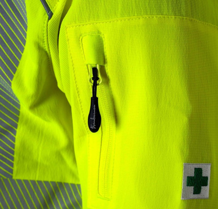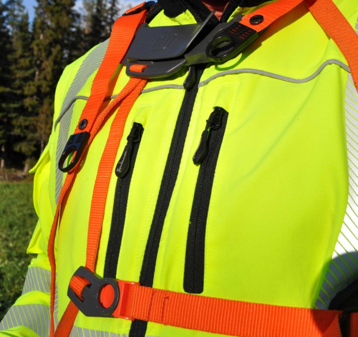 Arbetsjackan är av allroundmodell och utrustad med ett flertal praktiska fickor. Bröstfickorna är lätta att komma åt även när man har röjsågsselen på sig och den tydligt markerade fickan för första förband tycker vi är värd ett stort plus. Den är placerad på vänster arm och lätt att komma åt, utan att röjsågsselen måste tas av eller jackan knäppas upp. På den andra ärmen finns en ficka för mobiltelefonen.