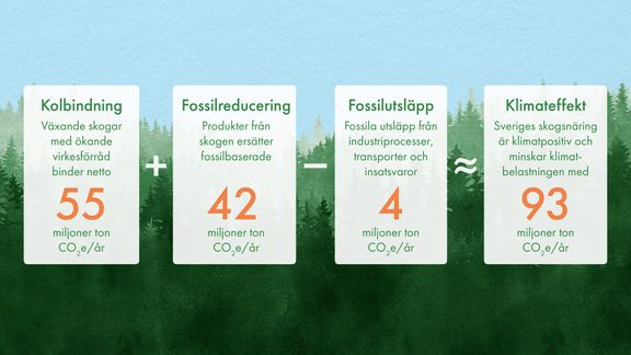 Enligt rapporten har den svenska skogsnäringen en positiv effekt på det globala klimatet motsvarande  93 miljoner ton koldioxid per år. Det är nästan lika mycket som utsläppen från den svenska konsumtionen, nämligen 100 miljoner ton.