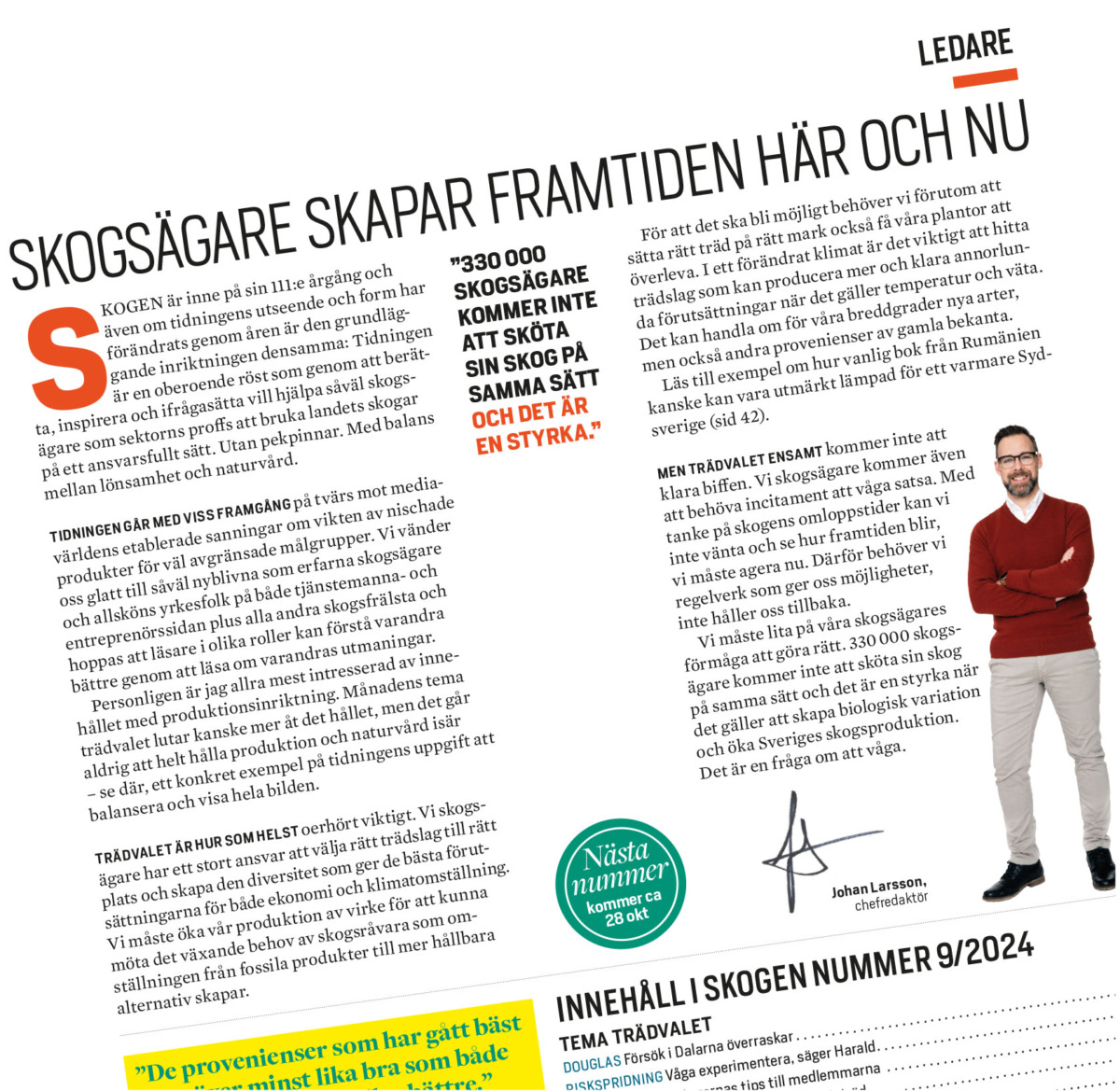 Personligen är jag allra mest intresserad av innehållet med produktionsinriktning. Månadens tema trädvalet lutar kanske mer åt det hållet, men det går aldrig att helt hålla produktion och naturvård isär – se där, ett konkret exempel på tidningens uppgift att balansera och visa hela bilden.