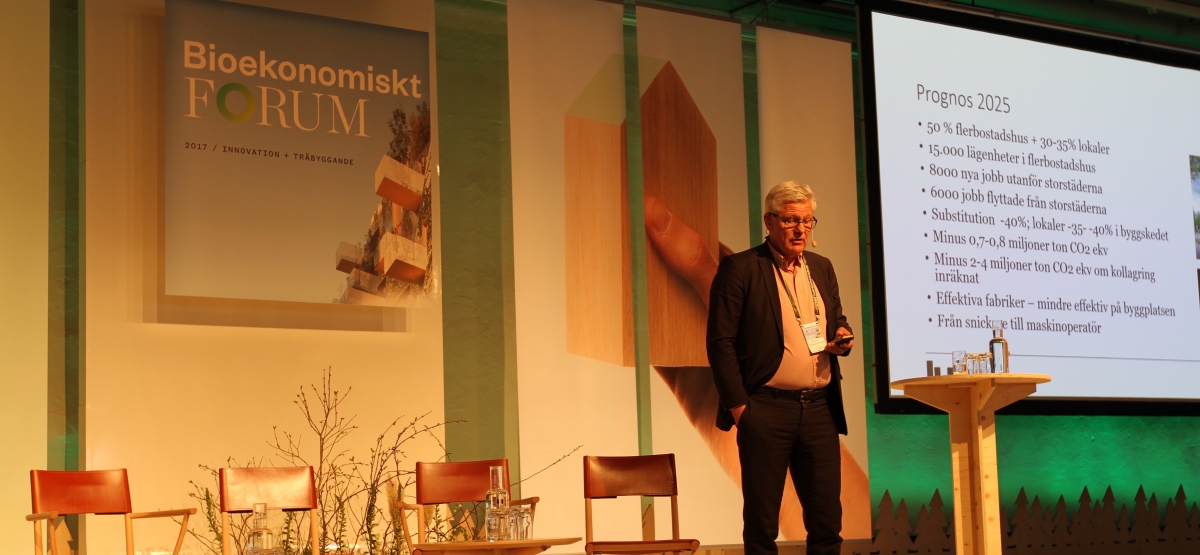 – 10 000 lägenheter i trähus är redan i dag påbörjade eller planerade. Utbyggnaden av nya och befintliga trähusfabriker i Sverige gör det fullt möjligt att komma upp i 15 000 nya lägenheter per år till 2025, sa han på Bioekonomiskt forum i Stockholm.