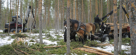 Företaget använder sig av sex nordsvenska hästar som används växelvis för skotningen av virket. Hästarna fraktas med buss och har låga stilleståndskostnader de dagar när Daniel och Lars-Olov röjer.