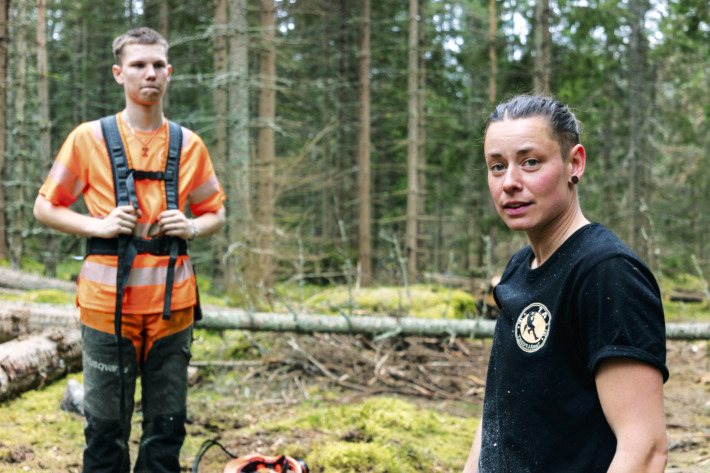 På avstånd hörs även någon som kvistar en trädstam med en motorsåg på botten av en ganska djup sänka. Dent är Filip Åsenfalk som till vardags studerar på naturbruksgymnasiet i Vreta, men som för tillfället gör sin praktik hos Tom Axelsson. I dag är han sysselsatt med att manuellt fälla och kvista en del grova och barkborreskadade granar och träd som drabbats av toppbrott.