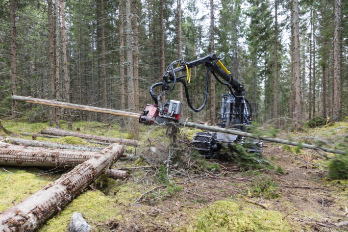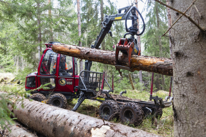 Skördaren från Alstor är en liten smidig maskin som tar sig fram i stort sett överallt, men den var enligt Tom lite för liten för hans behov. Då och då handlar hans uppdrag även om lite grövre gallringar.