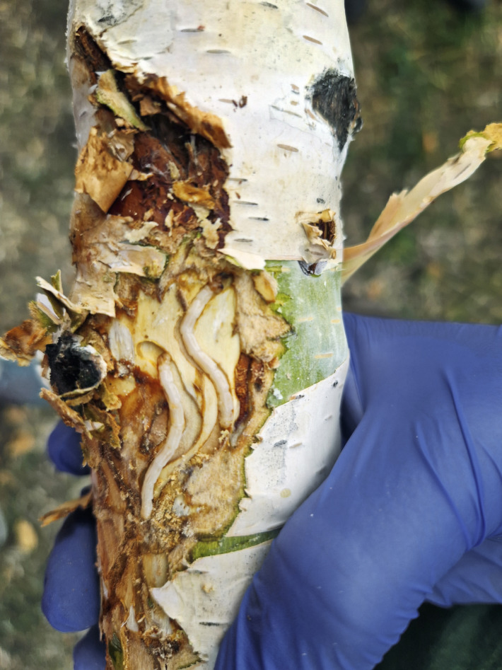 Försök inte själv bekämpa skalbaggar eller larver. Flytta inte växter eller växtdelar från området, och flisa inte den angripna björken.