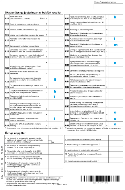 e.R9: Här sker avskrivningar (förslitningsavdrag) för inventarier och byggnader som tillhör näringen. Inventarier skrivs oftast av med 30 procent på det skattemässiga restvärdet. Inventarier av mindre värde, för 2012 understigande 22 000 kr, är dock direkt avdragsgilla vid ruta R5. För näringens bostads- och ekonomibyggnader sker årlig avskrivning med    2 respektive 4 procent på avskrivningsunderlaget.